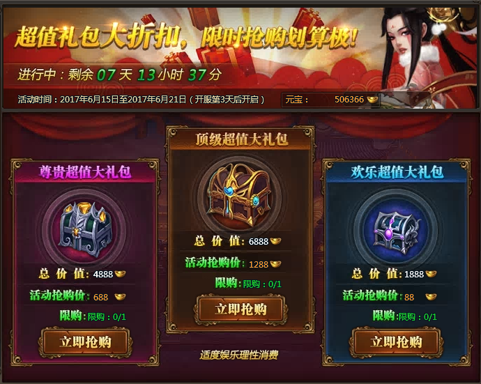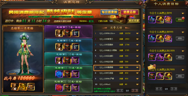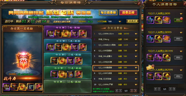 【活动内容】:活动期间,排行榜分为每日消费榜以及消费总榜,每日消费榜是每天进行结算,玩家每日消费达1000元宝即可进入每日榜的前10名,消费总榜是累计4天的总消费元宝进行排名,4天内消费达2000元宝的玩家即有机会进入前10名,另外还有每日个人消费奖励