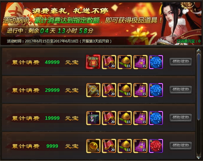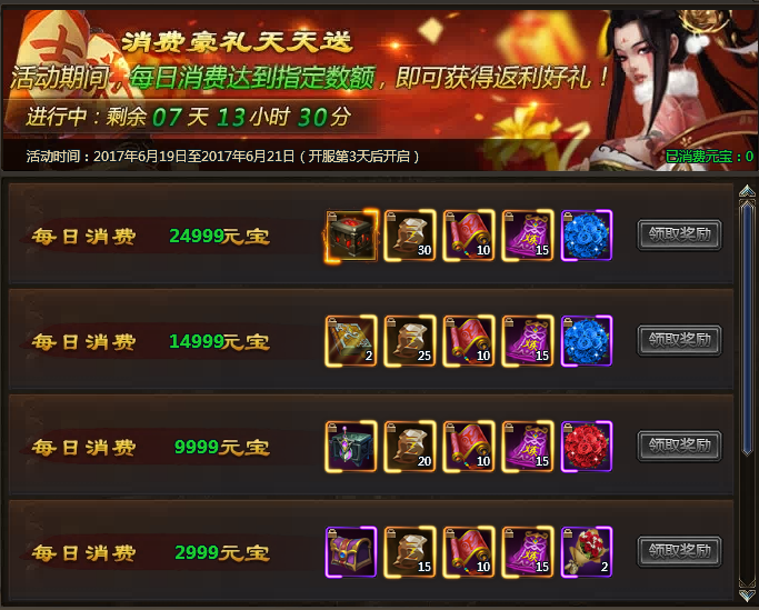 【活动内容】:活动期间,每日消费达到指定数额,即可获得大量奖励