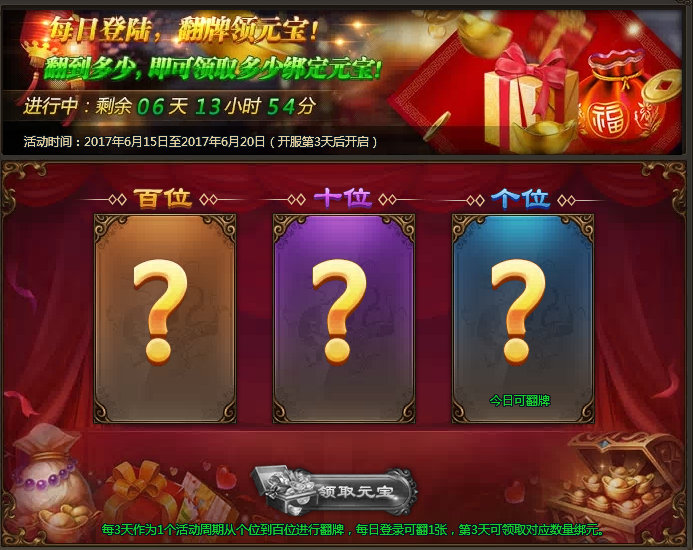注:每日登陆即可翻一张牌,从个位开始,三张都翻了即可对应数字的绑元,每3天一个活动周期