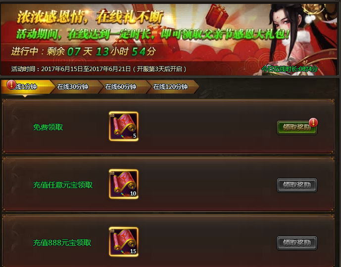 【活动内容】:活动期间,每日定时在线,可领取在线奖励