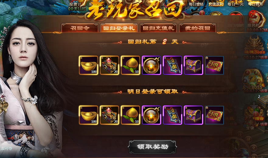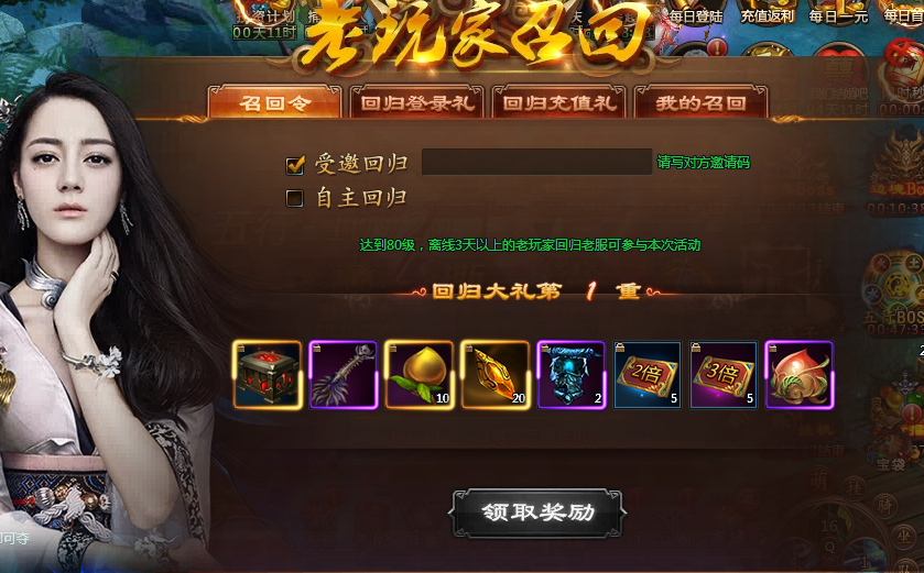 2.老玩家通过受邀回归或自主回归,可领取回归第1重礼包;