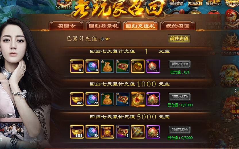 4.老玩家回归后,活动期间累计充值达到一定额度可领取回归充值礼包;