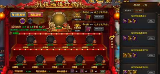 【活动内容】:活动期间,排行榜分为每日祝福榜以及祝福总榜,每个榜单又分为男女两个榜,玩家使用祝福卡即可提升祝福值,每日祝福值达到495即可进入每日榜前10,总榜祝福值达到990即可进入总榜前10,另外还有每日个人祝福值目标奖励