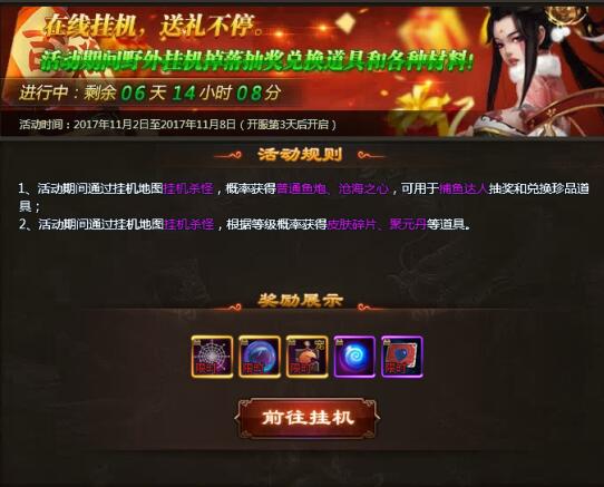 【活动内容】:活动期间,挂机掉落可获得皮肤碎片、聚元丹等珍稀道具