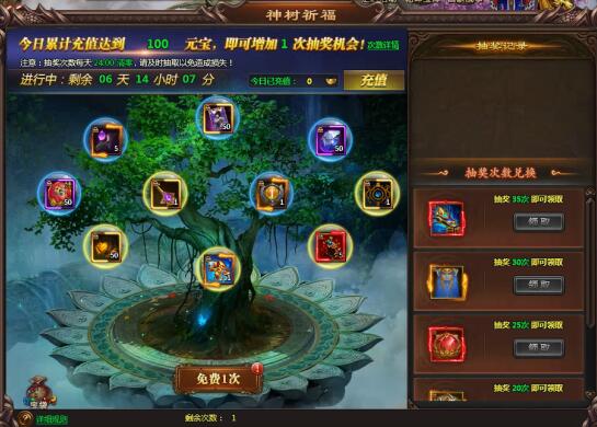 【活动内容】:活动期间,每日拥有1次免费抽奖次数,每日累充达到指定额度可增加抽奖次数,抽奖可获得神树内的道具,达到额定次数还可领取额外奖励
