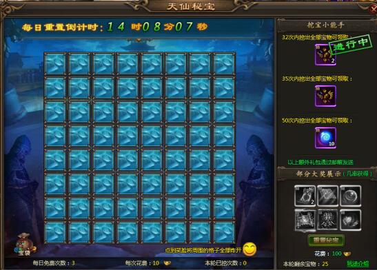 【活动内容】:活动期间,可在活动界面进行挖宝,每日有3次免费次数,挖出所有宝物后可消费元宝进行重置,规定次数内挖出全部宝物还可额外获得奖励